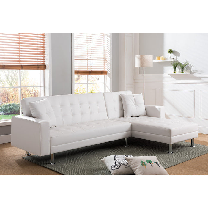 • Soft PU / Faux Leather Upholstered Click Clack Convertible Sofa Bed • Reversible Left or Right Chaise L-Shape Sectional • Removeable Chaise to Front to convert Into Bigger Bed • Metal Chrome Cylinder Legs • 2 Throw Pillows Included • Easy to Assemble • Maximum Weight Capacity: up to 881.85 lbs. per SEAT: up to 297.62 lbs. CHAISE: up to 352.74 lbs.