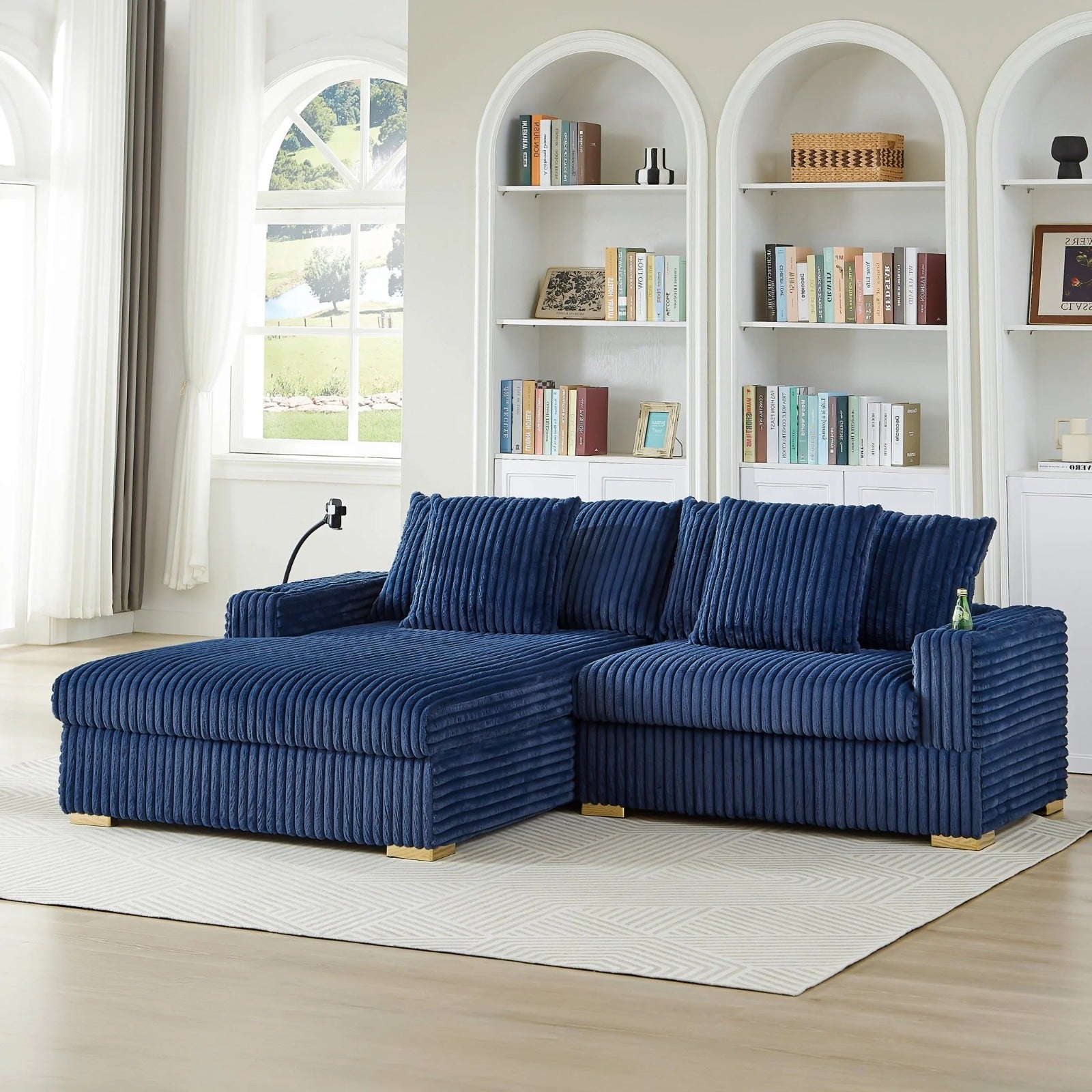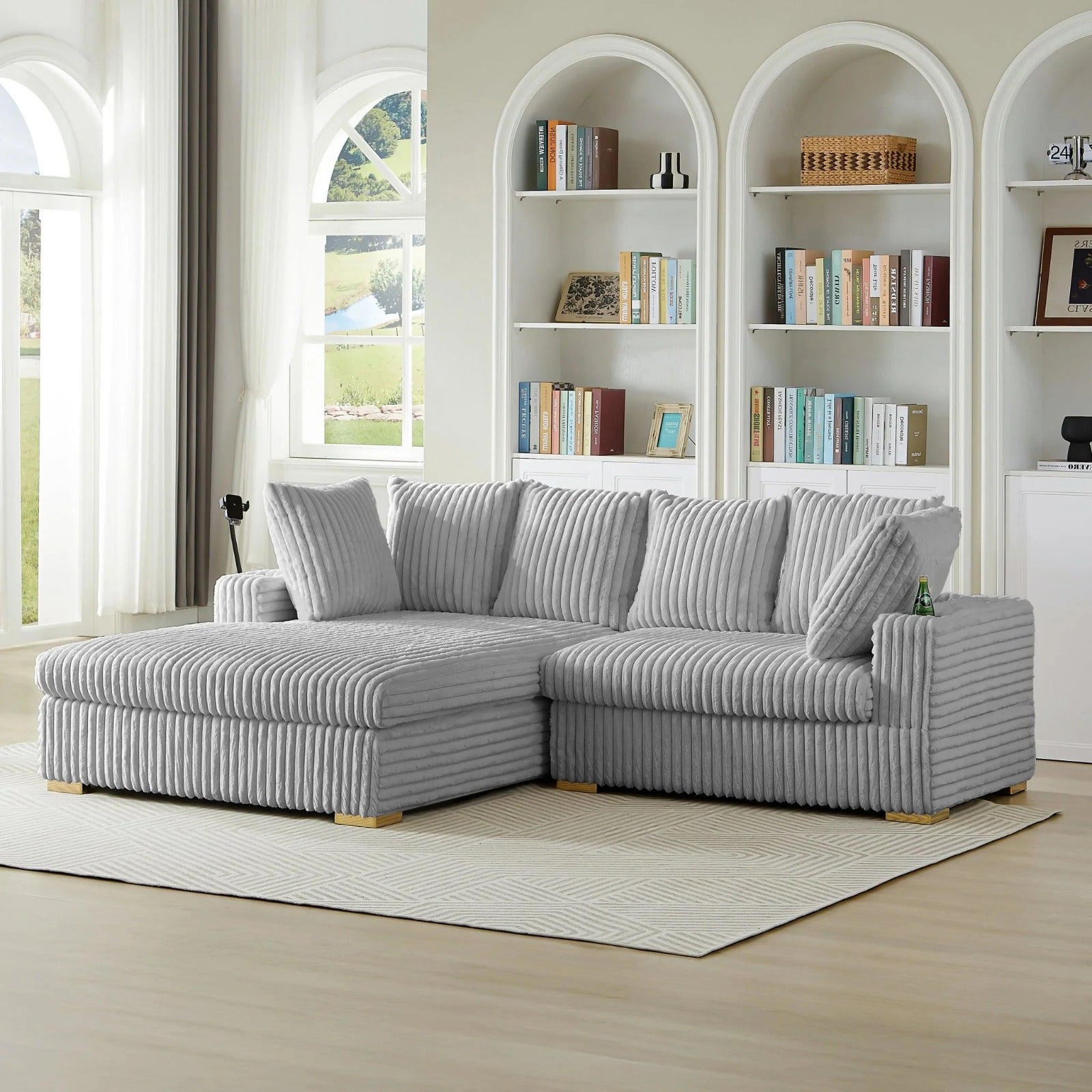 This luxurious sofa chaise is designed for ultimate comfort and style. Upholstered in a soft, ribbed corduroy fabric, it offers a wonderfully cozy and inviting feel, making it the perfect spot to relax.