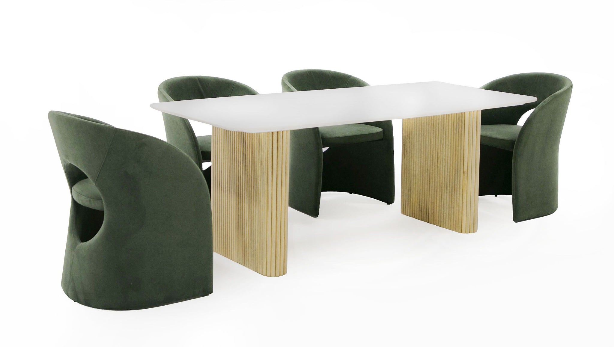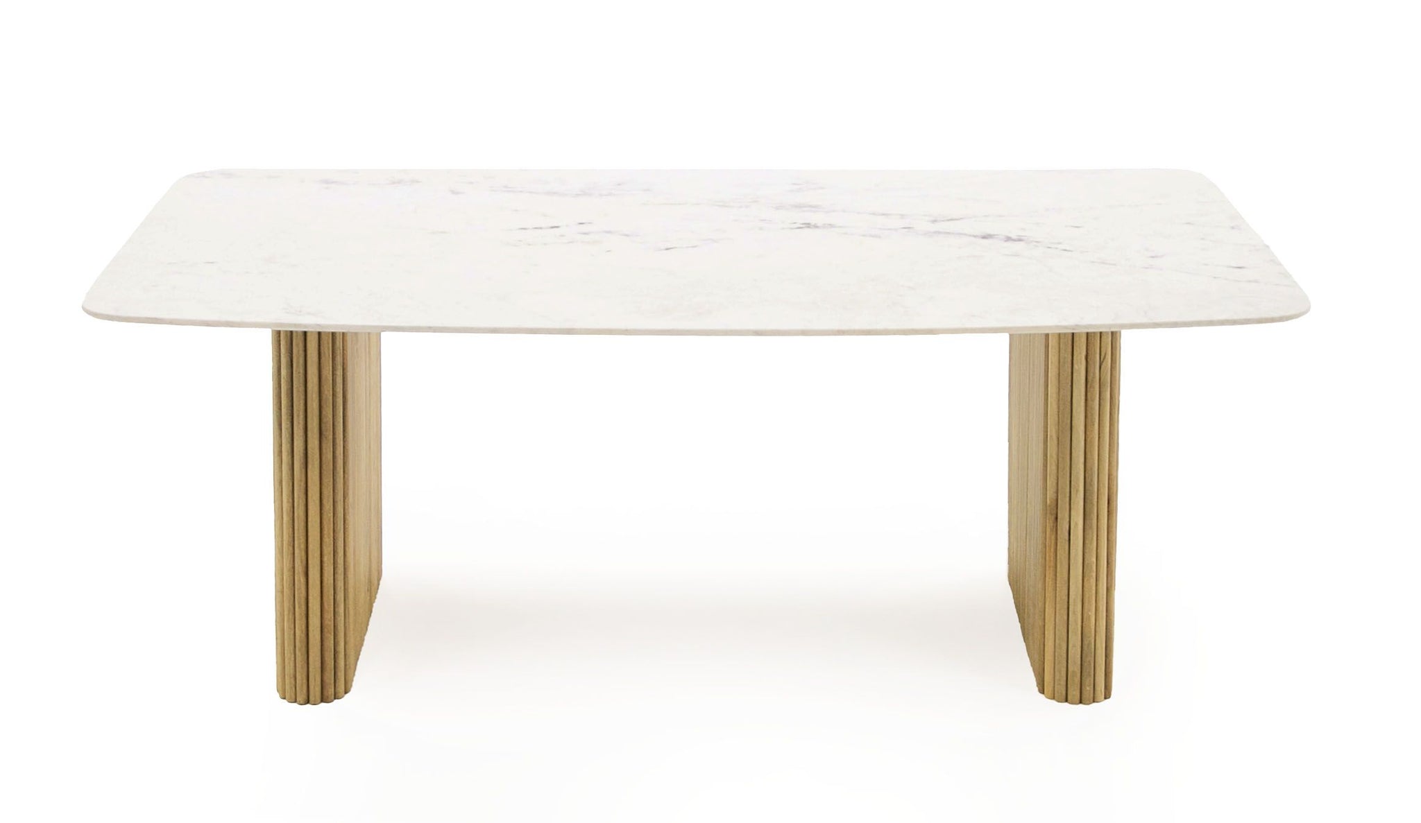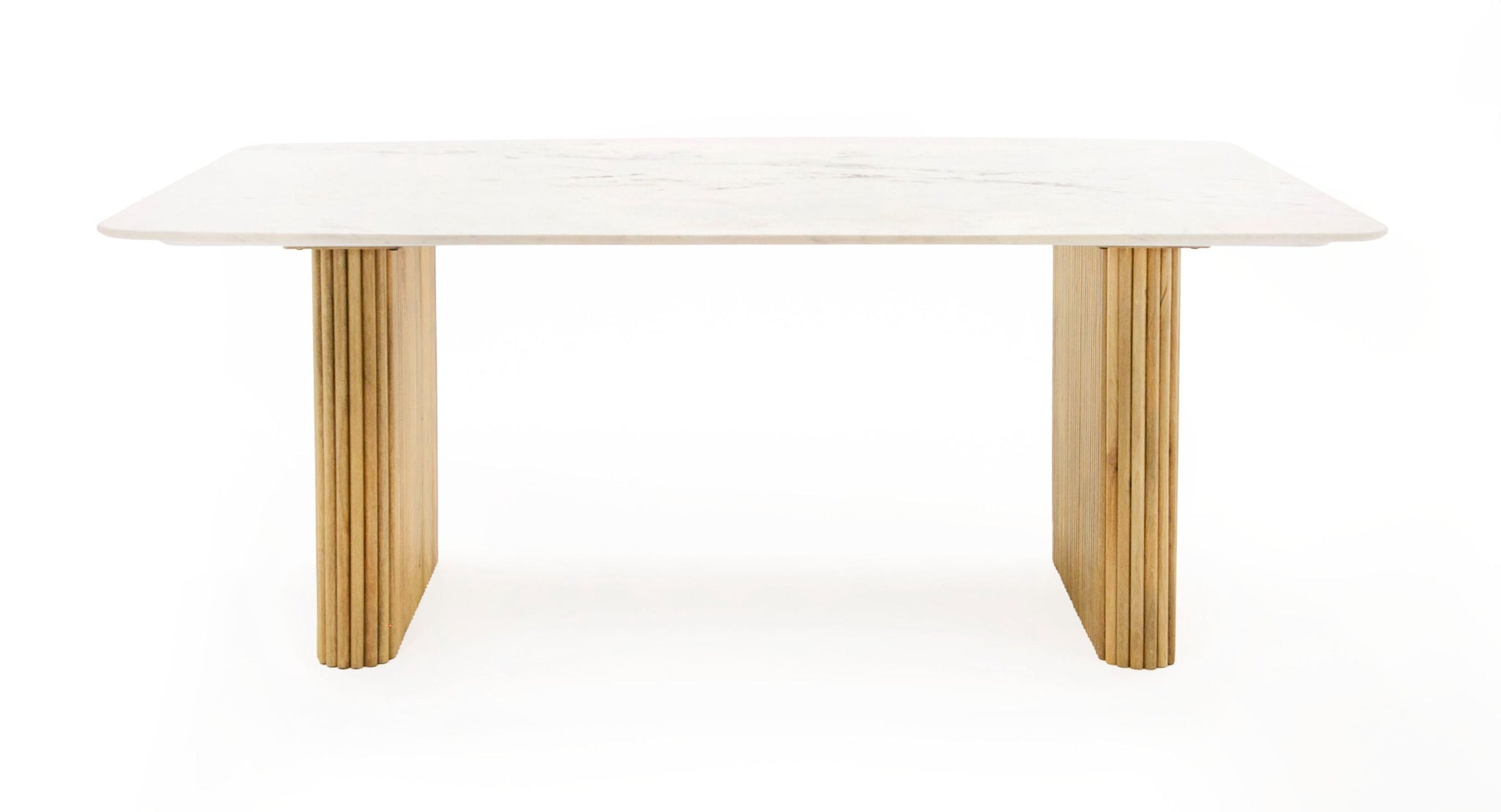 The Modrest Cambridge Rectangular Dining Table adds a clean and dynamic vibe to your dining room with its washed mango wood double pedestal base and visually appealing white marble top.