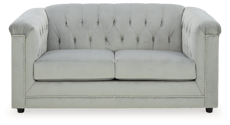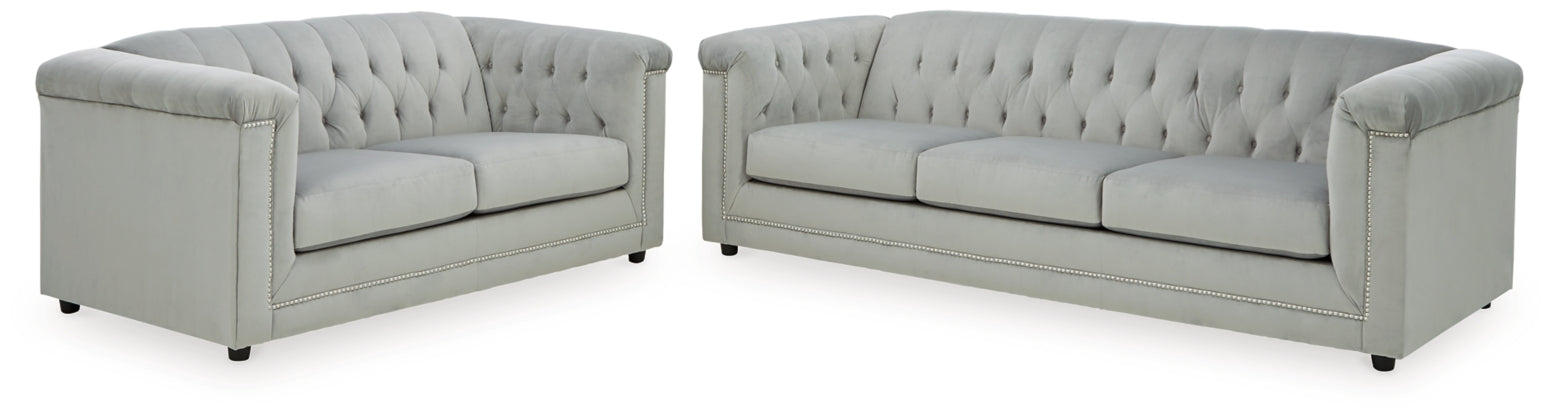 With a timeless classic Chesterfield styling that's very much in vogue, this seating package makes a brilliant statement. Its beautifully neutral silvery gray velvet fabric looks as good as it feels. Nailhead trim, button tufting and high shelter arms give the set an effortlessly elegant appeal. The hidden leg design is an on-trend addition for modern spaces.