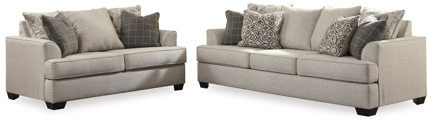 For the style enthusiast on a mission. This sofa and loveseat set takes a unique approach to design. Back cushions flaunt a vintage-inspired “Paris” script. Throw pillows continue the charm with gray-infused scroll and plaid patterns. Flared arms and neutral hue lend transitional appeal. Covered in a luxurious linen-like chenille, its softness and luxurious comfort will keep you coming back.