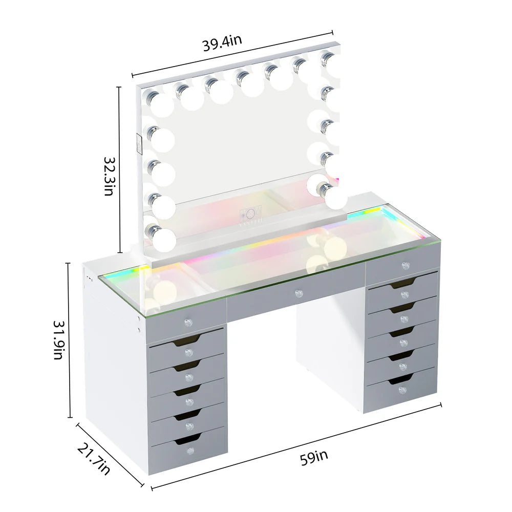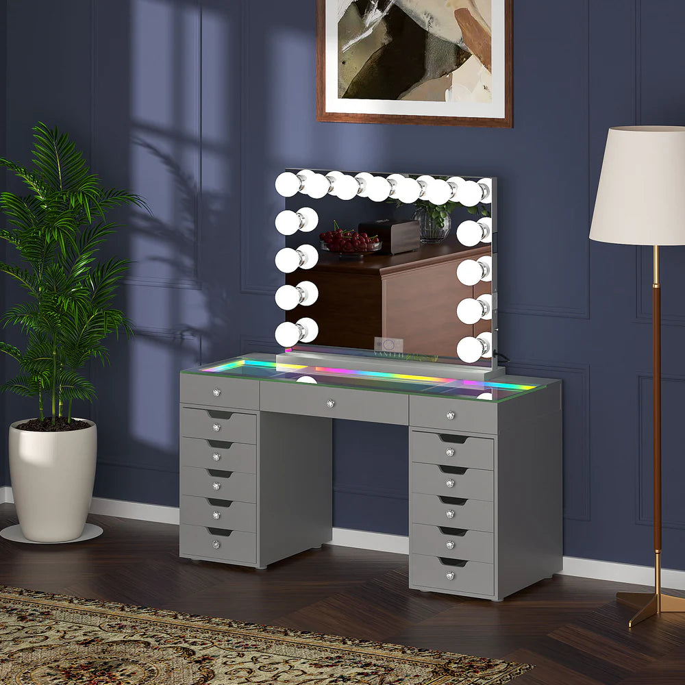 Transform your beauty routine with the VANITII Eva-RGB Vanity Set, a professional-grade makeup station featuring 13 ultra-spacious drawers15 adjustable LED bulbs, and customizable RGB mood lighting. This complete vanity solution combines massive storage with salon-quality illumination for the perfect getting-ready experience.